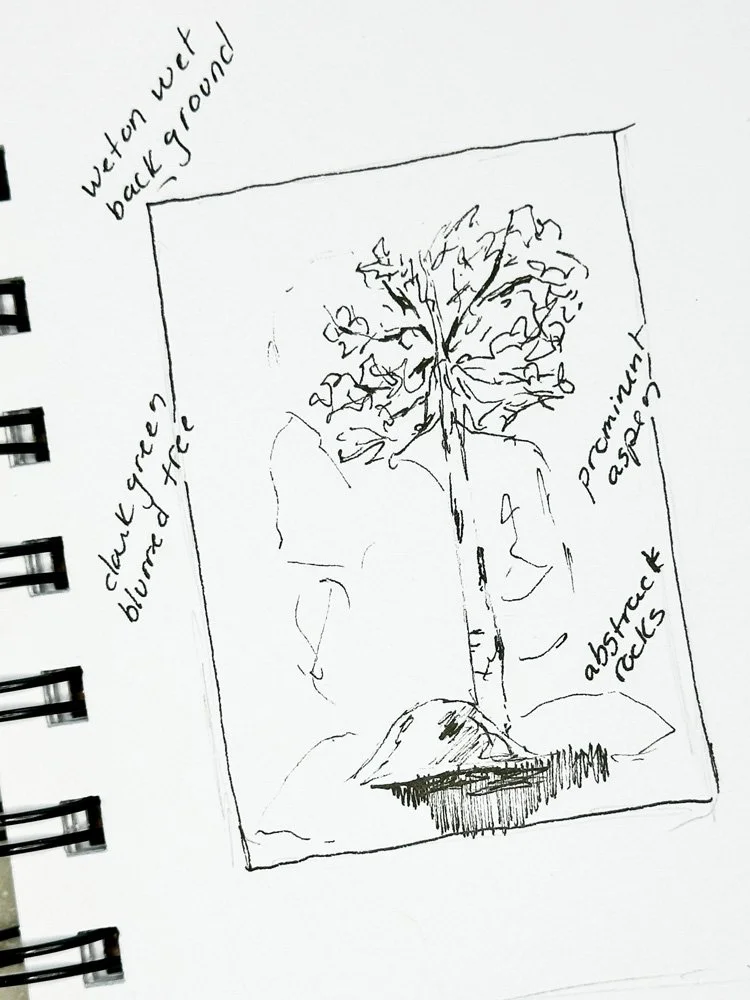 In this sketch, I wanted to play with the idea of how aspens grow in the mountains. I wanted to use the wet on wet techniques to give a hint of pine trees to contrast against the aspens at their peak in the fall and I hoped to explore the rocky backdrop you often find in the mountains.