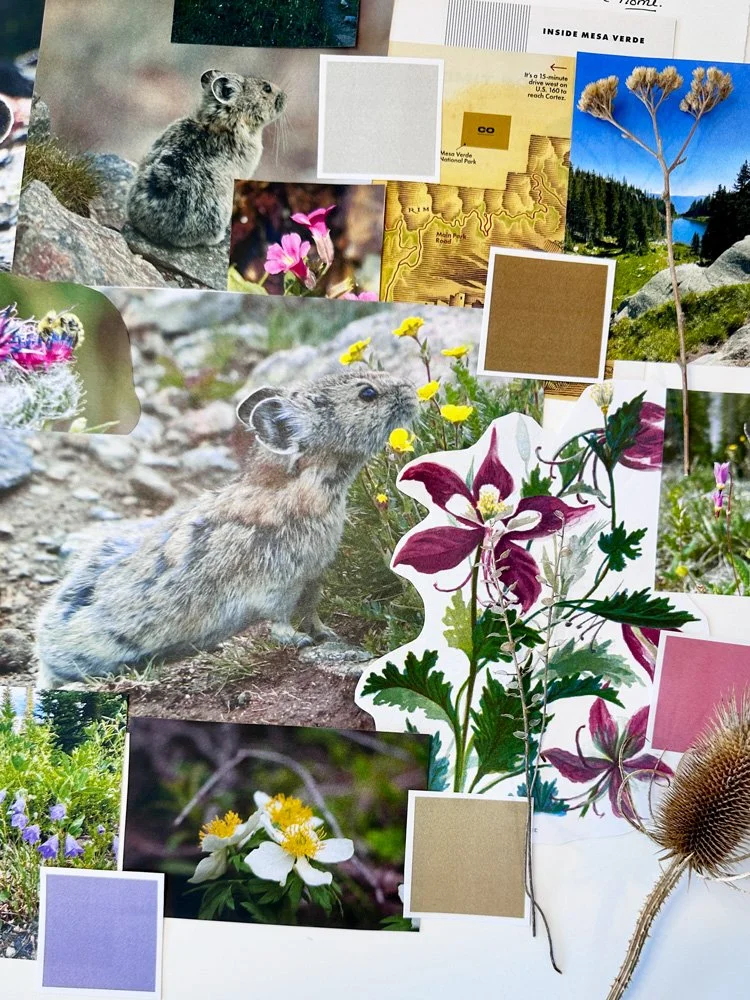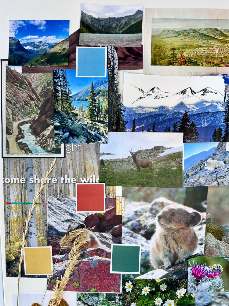 The layout of my board roughly mirrors the landscape of the mountains themselves. This felt like the power of a mood board because I didn’t initially set out to organize the images in this way; it’s just what happened. At the top are large landscape images and color swatches of cool blues and grays representing the sky and distant peaks. In the middle are animals and trees: pikas, mountain goats, elk, aspens, and pine forests, along with deeper greens, reds, and browns. At the bottom are ground-level details like wildflowers and mushrooms, with richer greens, purples, and earthy tones. Seeing all of these references in one place made the collection feel far more tangible than it had earlier in the week. I took multiple pictures of my mood board to reference as I moved into the artwork creation stage.