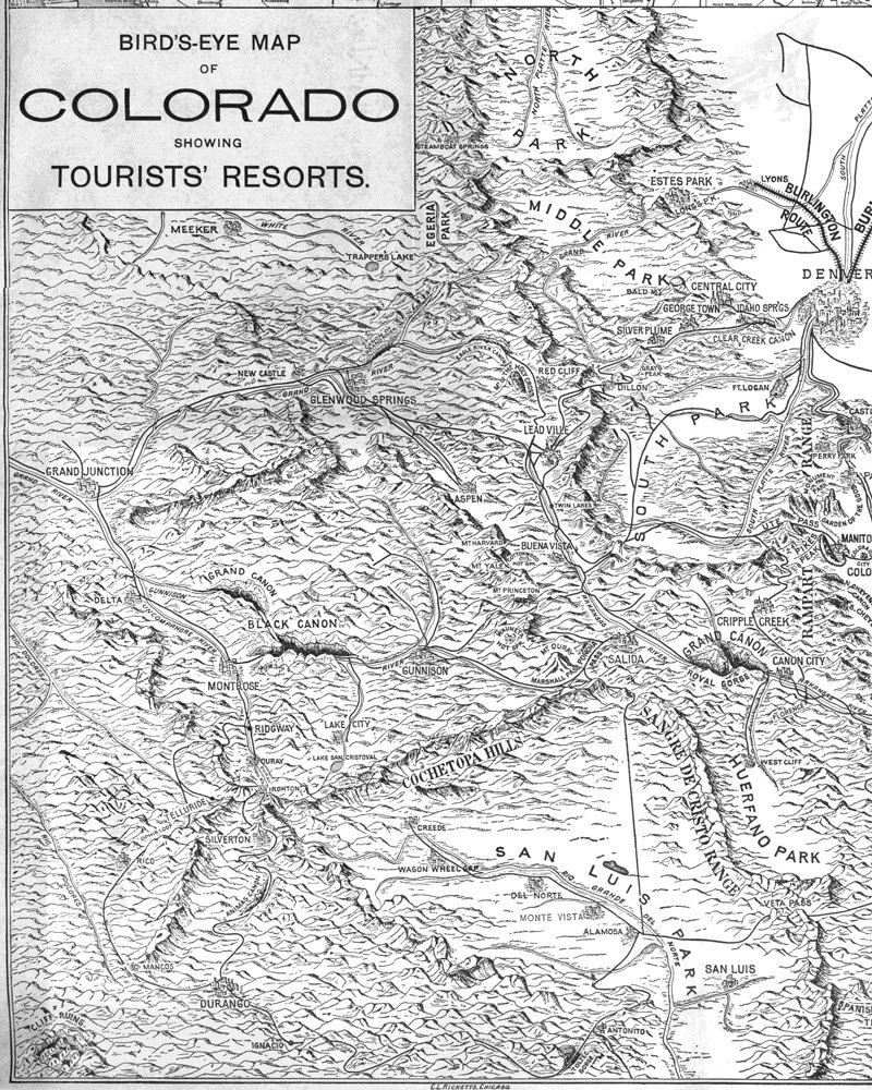 Colorado Outings by James Steele from 1898 published by the Chicago, Burlington, and Quincy Railroad Company that featured photographs and maps of early Colorado.