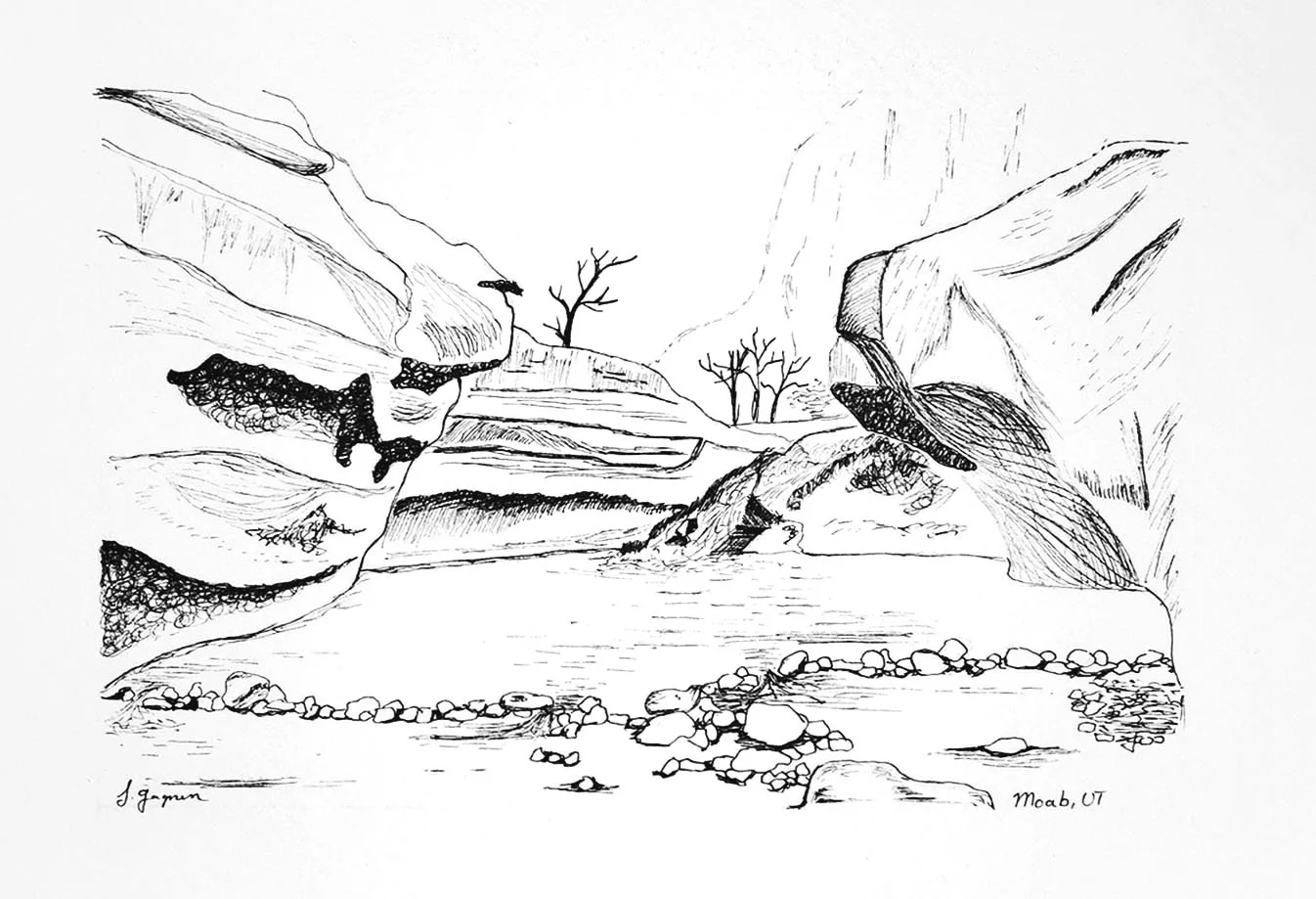 Ink Drawing, Mill Creek Waterfall, Moab, Utah